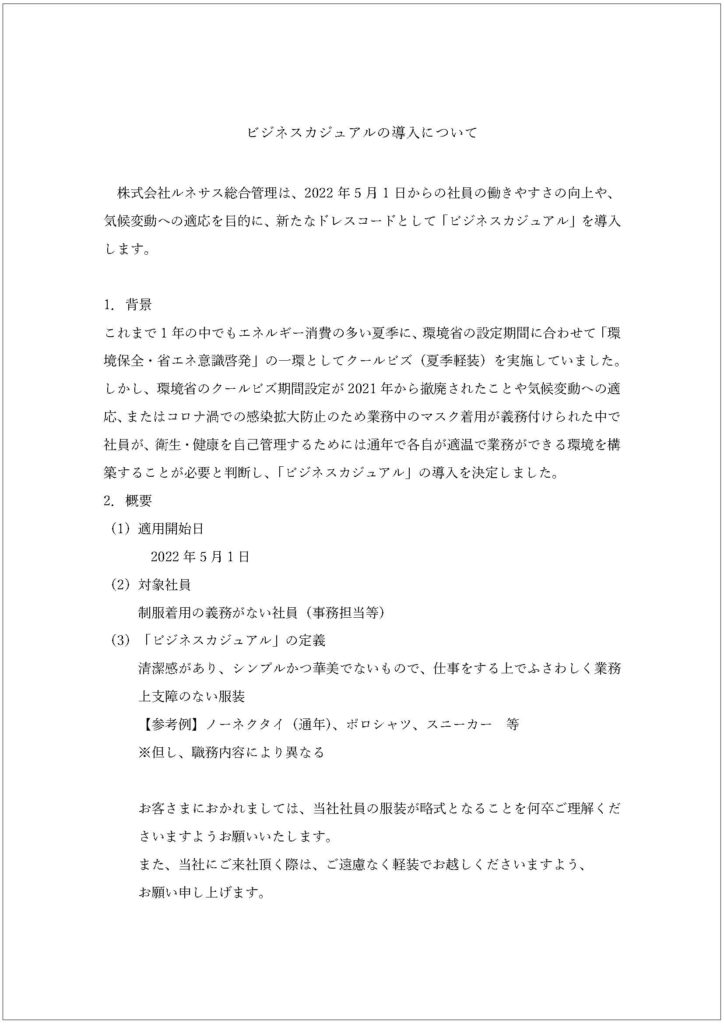 ビジネスカジュアルの導入について